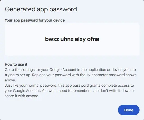 At the end of creating your app passwords, a password will be displayed; save it, it will be used for the password field when setting up the SMTP server in Immich.